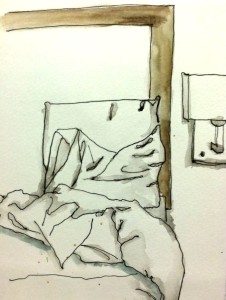 Brought a friend to her followup dr visit. She had some nasty vertigo when we arrived at the hotel, so we ordered in. I sketched my bed while waiting for the food to be delivered in.