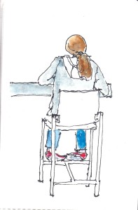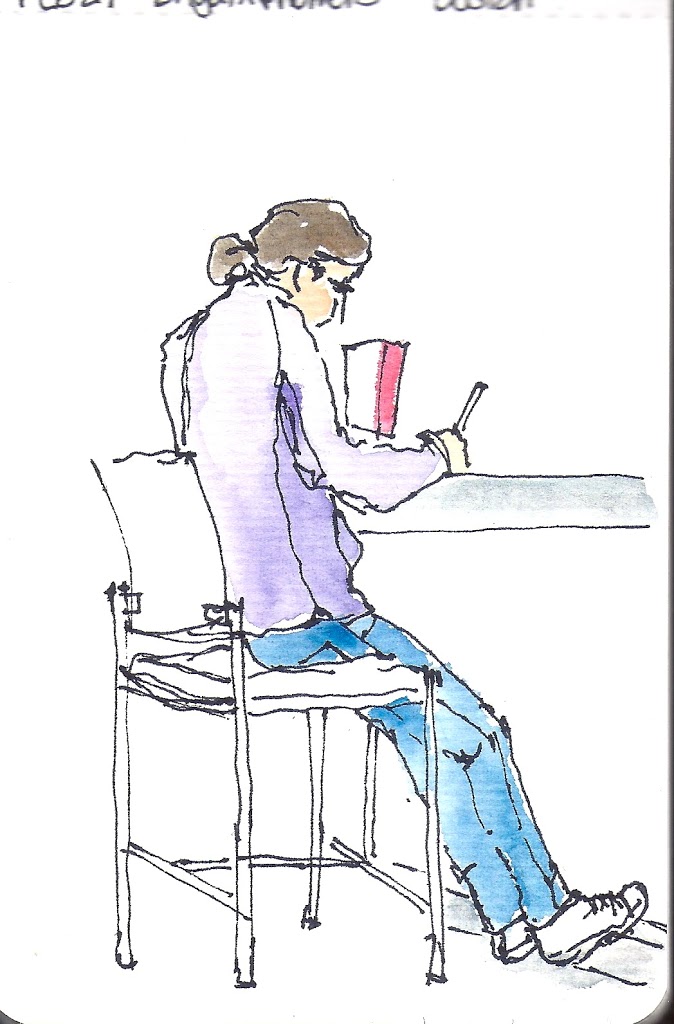 Brigham & Women’s Hospital cafeteria is equal to a gourmet restaurant! I had pumpkin raviolis with mushrooms and artichokes covered with a white butter sauce. Soo good! I ate it so fast, I had time to sketch these folks sitting at the window counter in front of me.