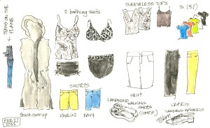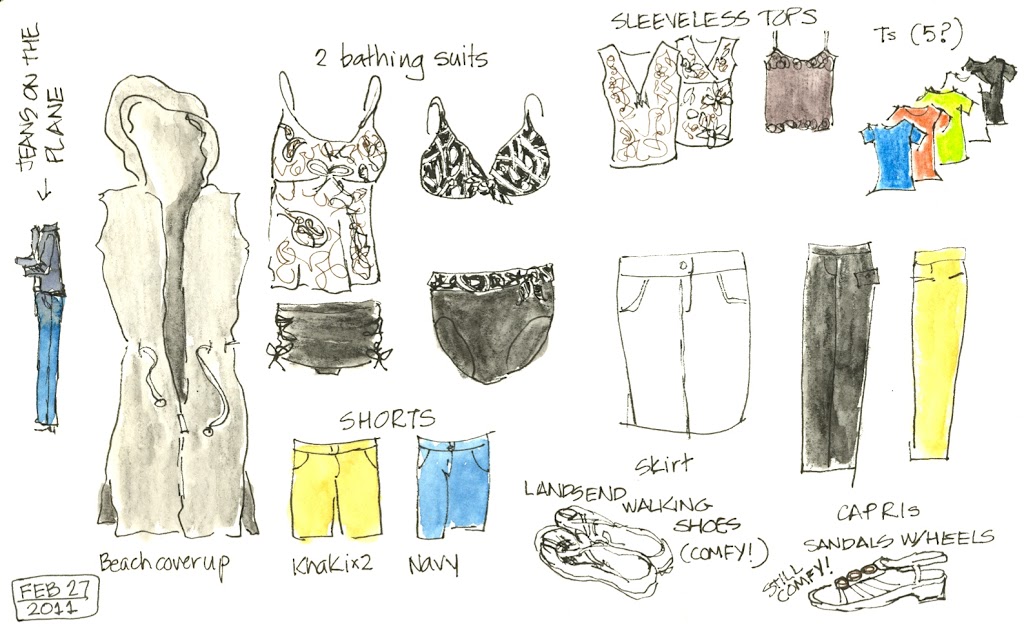 I’m having trouble deciding, as usual! Basically we have 3 days and 4 nights there, plus 2 days of travel. Do I really need FIVE tee shirts? Oh, and I didn’t draw my sketch kit, but that is going in my carry-on.