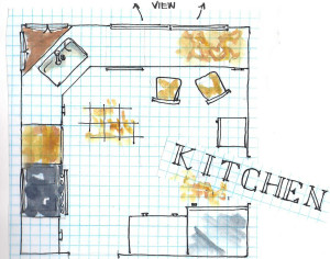 I’d like to sketch a plan of each room in my house, with notes about each room. I like to sit at the counter with my coffee, and enjoy the view. It’s not a huge kitchen, but it certainly works for me.